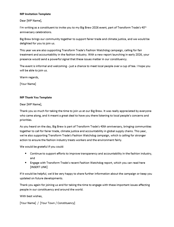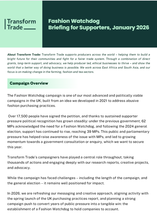 In 2026, we want to make some big strides in our Fashion Watchdog campaign – and we’d love to have your help. Showing your MP how committed your community is to trade justice, with everyone gathered together, and sharing why we need a Fashion Watchdog could make a huge difference.